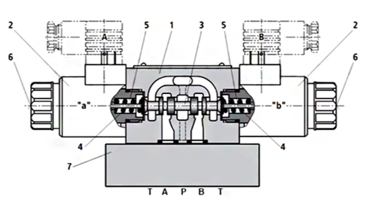 Гидрораспределитель ПГ73-1 состоит из: корпуса (1), двух электромагнитов (2) (каналы А и В), золотника (3), возвратных пружин (4) и плиты (7). В спокойном состоянии золотник (3) удерживается пружиной (4). Когда вы подаете питание на электромагнит (2), он перемещает золотник (3) через толкатель (5), направляя поток жидкости от P к A и от B к T, или от P к B и от A к T. Электромагниты ввёртного типа работают в масле – это необходимо для их долгой службы и надежной работы. После отключения питания золотник (3) возвращается в исходное положение пружиной (4). При необходимости, золотник (3) можно перемещать вручную, без электромагнитов, используя ручное дублирование (6).